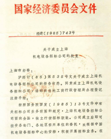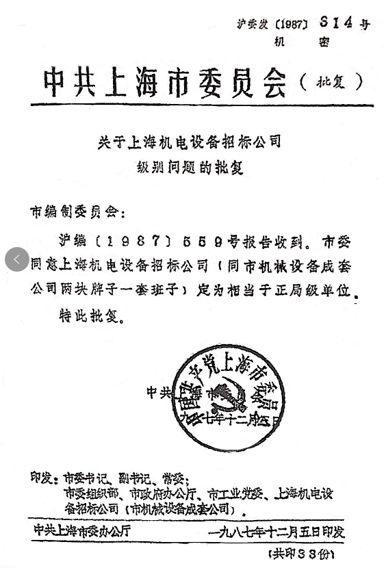 中共上海市委批復(fù)上海機(jī)電設(shè)備招標(biāo)公司定為相當(dāng)于“正局級(jí)”單位。