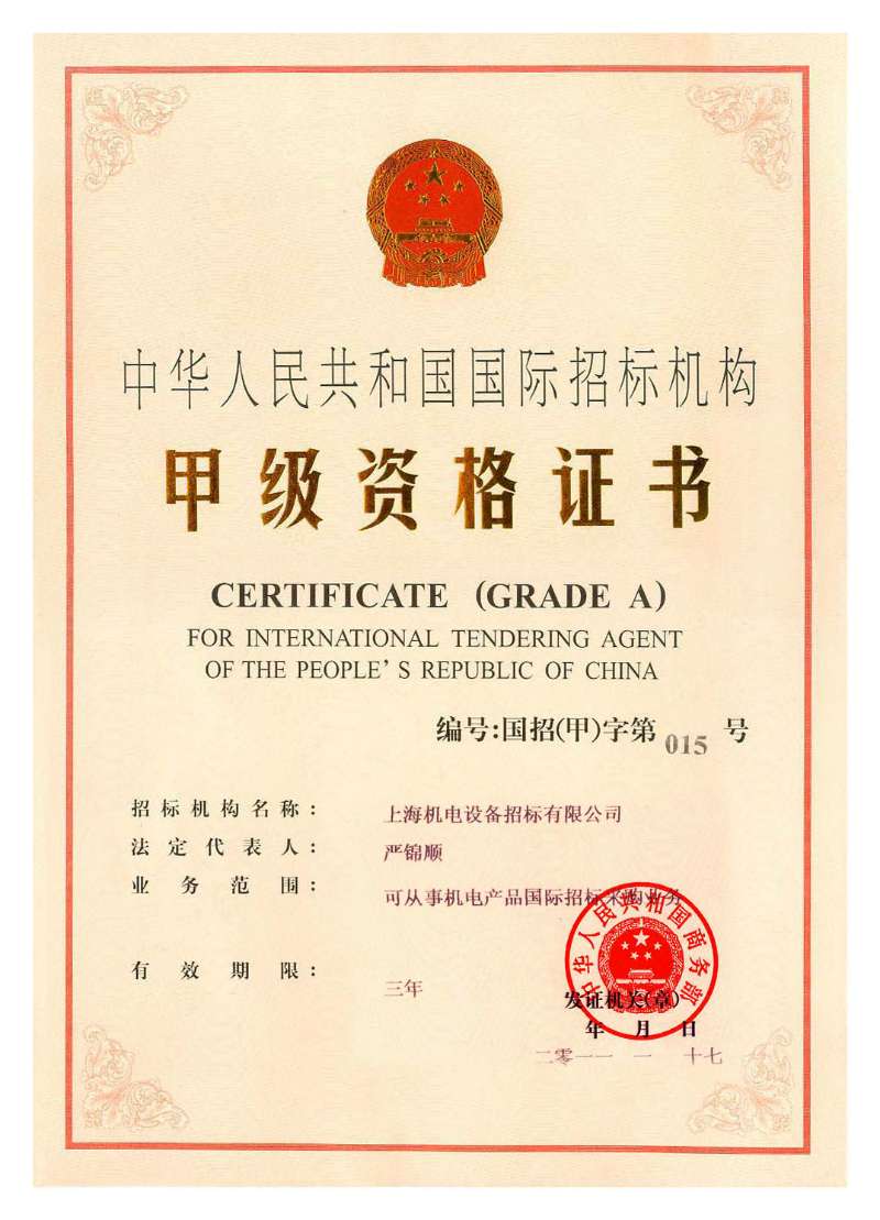 國(guó)家對(duì)外貿(mào)易經(jīng)濟(jì)合作部授予的首批《國(guó)際招標(biāo)機(jī)構(gòu)甲級(jí)資格證書(shū)》。